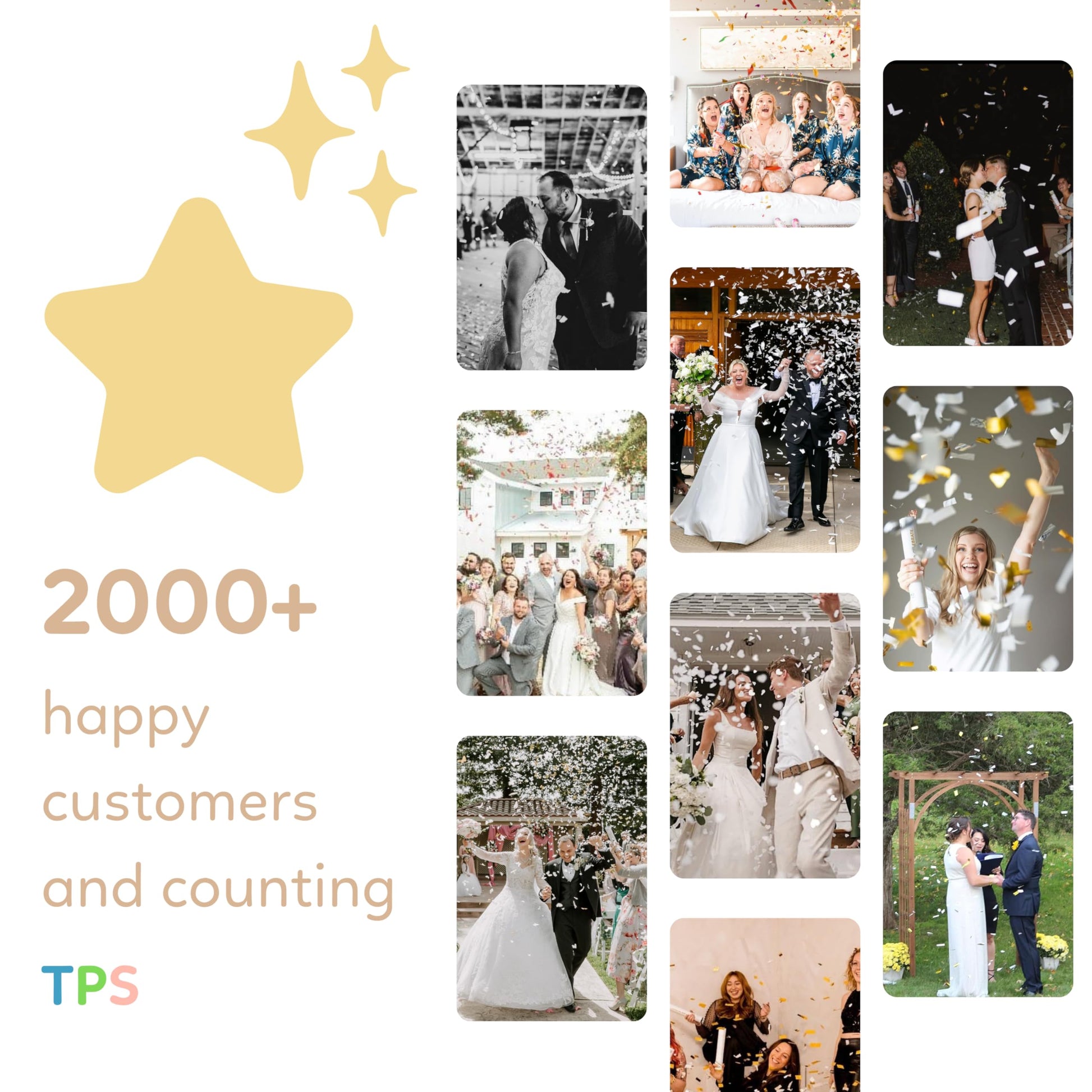 - BEAUTIFUL PICTURES - Each wedding popper is stuffed full with confetti that is made with special feather-weight technology. The result is slow falling confetti that creates a magical effect which lasts for several seconds after the pop! Make sure to save some for your photoshoot so you can savor the moment forever!