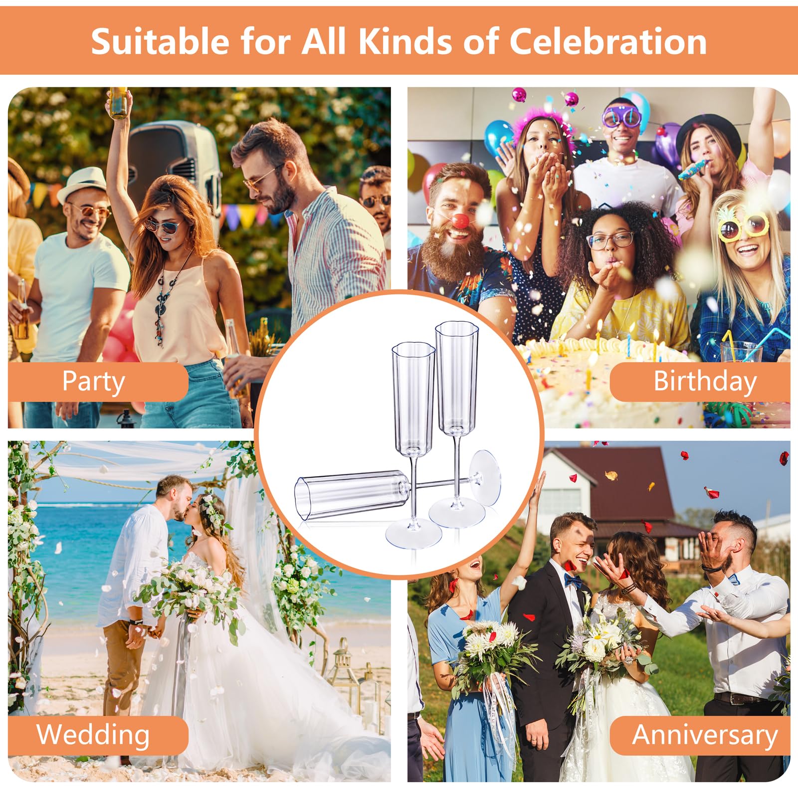 - For Grand Celebrations - This bulk set of champagne flutes plastic accommodates large guest lists. The holiday champagne flutes bundle ensures every attendee enjoys a stylish, reusable-quality toast without the fragility